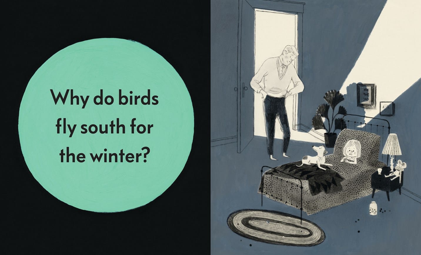 So sweet and beautiful. A little girl refuses to let her dad leave her bedroom by asking existential questions. Very authentic and feels like a slightly less surreal "if you're afraid of the dark remember the night rainbow"